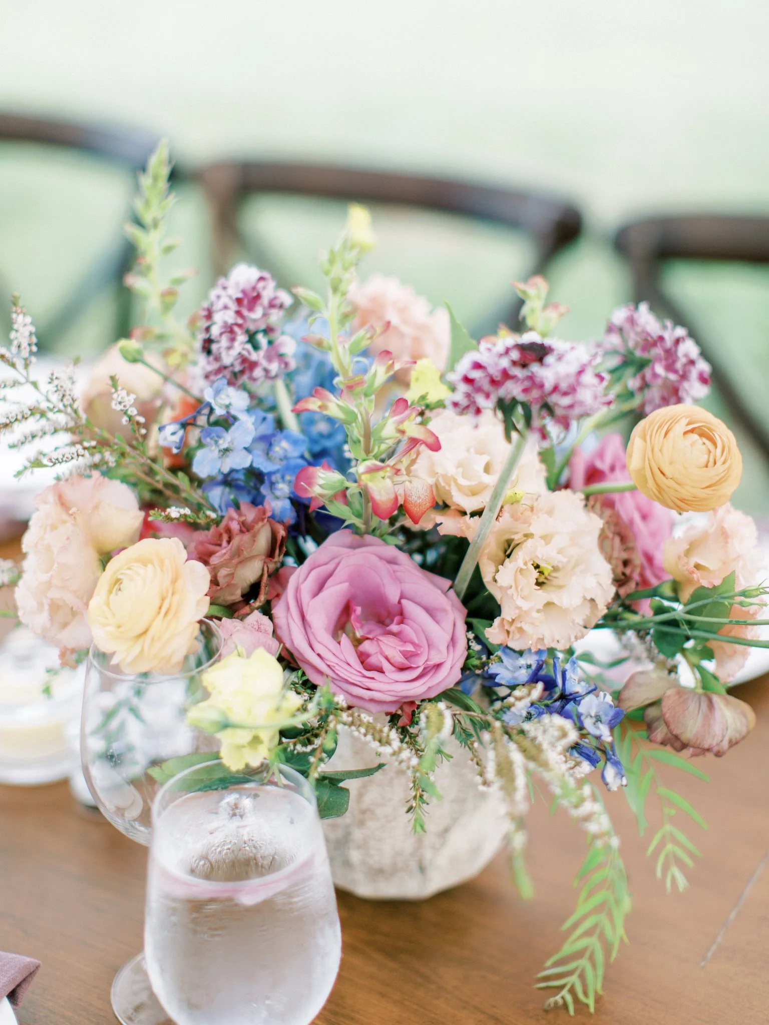 Soft shades of green & light blue with pops of plum, light pink, hydrangea blue, & mauve